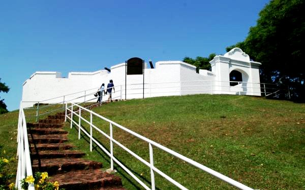 圣约翰山又叫圣约翰古堡,是荷兰殖民地时代的要塞,曾是防守马六甲古城的重要堡垒,现在只剩下一座白色的拱门。其特异之处是大炮口并非对着大海,而是指向陆地,因为他们深信已无敌于海上。站在山上,马六甲海峡展现在眼前,湛蓝的海面上轮船点点,滔滔白浪冲击着海岸的岩礁。